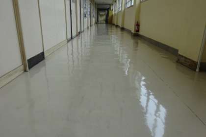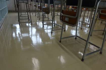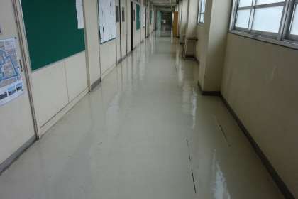 その暑い中、エアコンの利かない廊下や少人数教室の床のワックスがけを主事さん、ソシオ株式会社の方々がしてくださり、ピカピカの床になりました。年季が入っている校舎ですが、ワックスひとつで見違えるように見え、気分もさわやかになります。