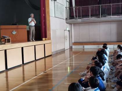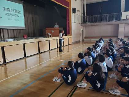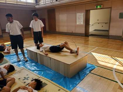 1年生は午後、生徒避難所体験をしています。最初に校長先生と避難所運営委員長さんからお話をいただきました。その後、各クラスに分かれて体験を始めています。段ボールベッドの寝心地はいかがでしょうか。