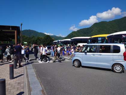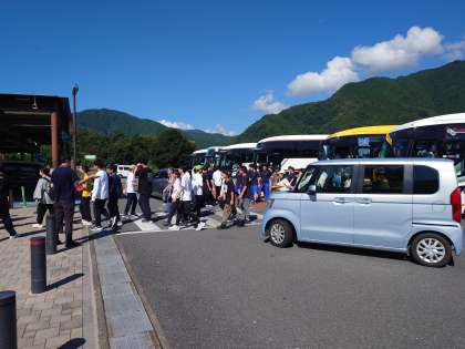 1年河口湖移動教室 1日目 公開日 2024/09/18 更新日 2024/09/18 できごと 順調にバスは進み、談合坂SAに到着。トイレ休憩です。 たくさんのバスが停まっていて、多くの観光客、児童、生徒がいます。