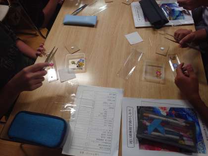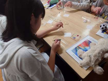 押し花定規作りです。いろいろな形、色、大きさの押し花を定規に貼り付けていきます。
