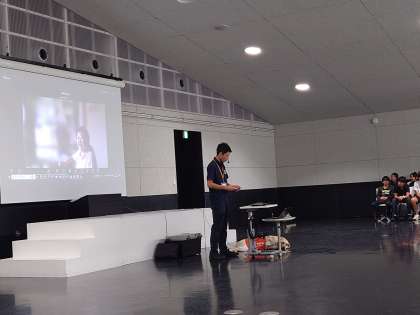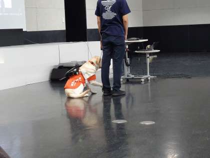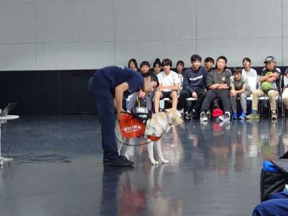 まずは盲導犬について動画を見て学習し、実際に盲導犬とそのユーザーにいろいろ教えていただきます。