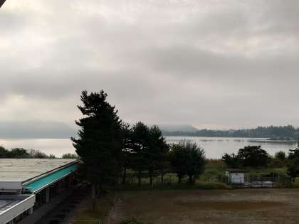 学園3階から河口湖は見えますが、空は曇っていて富士山は見えません。