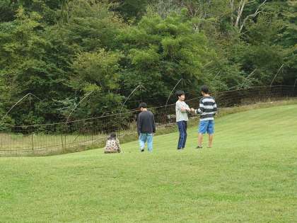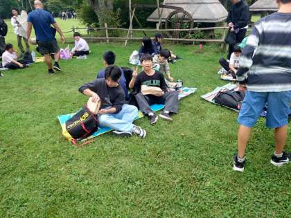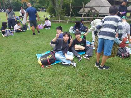 みんなで敷物を分かち合い昼食です。 食べ終わった後、少しの時間で鬼ごっこ。