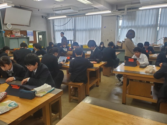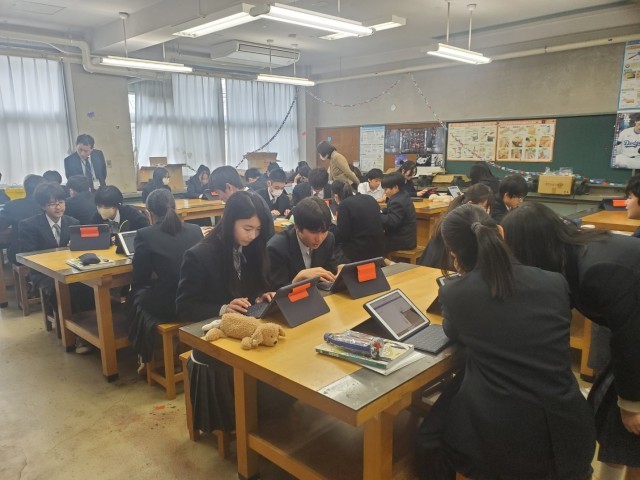 1年生は、講師をお招きしてプログラミングの授業を受けています。みんな楽しそうです。