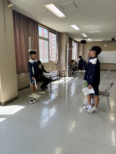 本日はジャージ登校です。ミーティングルームにて身体計測が行われました。身長、伸びたかな?