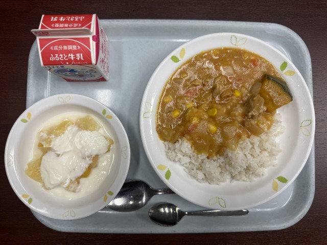 夏野菜のカレー フルーツのヨーグルトがけ 牛乳
