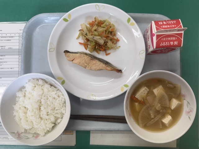 ごはん(有機米) 鮭のみそマヨネーズ焼き キャベツのおかか和え いなか汁 牛乳