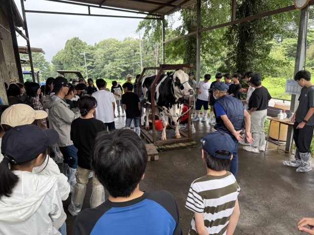 全員で酪農家の方のお話を伺ったあと、クラスごとに分かれて搾乳、餌やりを体験させていただきました。