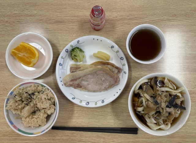 うどん 炊き込みご飯 たくあん ポークジンジャー ブロッコリー オレンジ 乳酸菌飲料 お茶