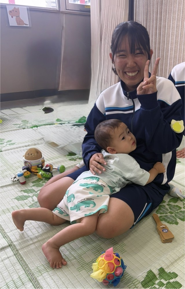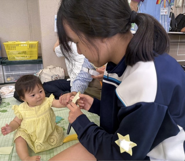 泣いてしまわないか、恐る恐る赤ちゃんにふれる生徒、距離をおいて眺める生徒、慣れた手つきで優しく抱っこする生徒、反応は様々でしたが、多くの生徒が赤ちゃんの純粋無垢な笑顔や仕草に心を奪われ、癒された様子でした。幼児に対する理解も実感として深まったようです。