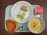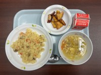 シーフードパエリア 卵入り野菜スープ キャンディーポテト 牛乳