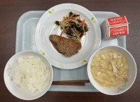 ごはん かつおのあずま煮 もやしとわかめのごま酢和え 飛鳥汁 牛乳
