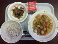 わかめごはん 豚肉と大根のうま煮 もやしと小松菜のごま和え 牛乳