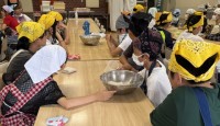 林間学園に戻り、夕食のうどん作りを行いました。粉と水を混ぜてしっかりとこねながら...