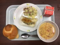 ミルクパン 魚のチーズハーブパン粉焼き ジャーマンポテト 卵とトマトのスープ 牛...