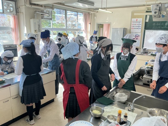 前回、インフルエンザによる学級閉鎖等で延期になってしまった調理実習・・・。本日、満を持しての実施となりました。生徒たちはとても嬉しそうにグループごとの調理に取り組んでいました。