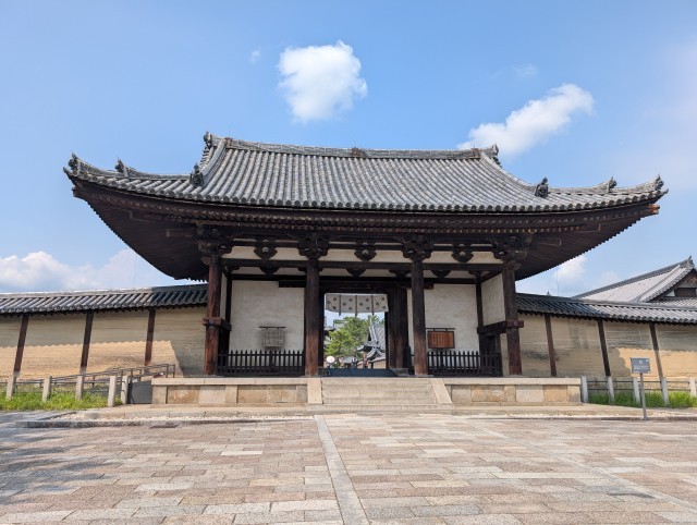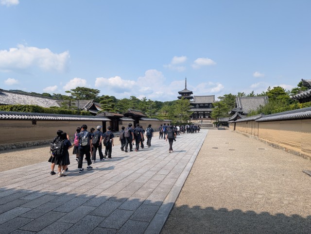 法隆寺にやってきました。暑くなっているので、適宜水分補給をしながらの見学です。
