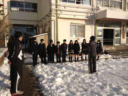 主事さんや教員とバスケットボール部の生徒で、通学路の雪かきを行いました。