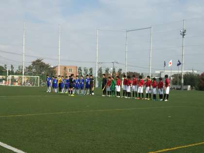 11月4日に都市大会場にて新人大会支部予選が行われました。この日の相手は、渋谷区予選を1位で通過した原宿外苑中でした。前半は互いに決定機を決めれず、このままハーフタイムかと思われた22分、中盤の選手からのスルーパスにFWが抜け出し、キーパーとの1対1を制し先制。後半に入り相手の攻撃をDF陣の体をはったプレーでしのぎ、ロスタイムに素早いカウンターから追加点2-0。ロスタイムには緑丘中キーパーが負傷し退場するなどのアクシデントもありましたが、全員の勝ちたいという気持ちが強く表れた素晴らしい試合だったと思います。あと1つ勝つと都大会です。来週の試合に向けて真剣に準備しましょう。たくさんの声援ありがとうございました。