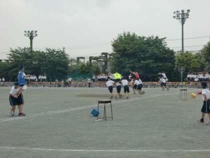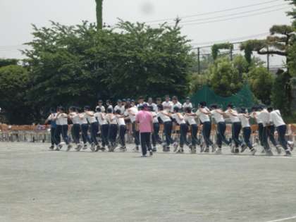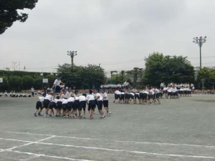 学年種目の様子です。左・1年・「矢切りの渡し」、中・2年「ローハイド」、右・3年「大百足競争」
