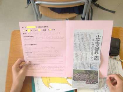 生徒たちは、自分で選択した新聞記事をもとに自分の考えをまとめ、グループで発表しあい、友達等の意見を聞くことにより、自分の考えを深めました。