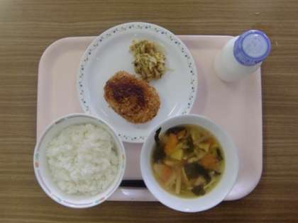 本日のメニューは、ごはん、ポテトコロッケ、よしの汁、白菜のおかかあえ、牛乳です。