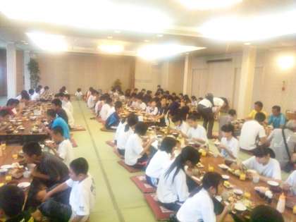 朝食はしっかりと食べます。練習会場に向けて順次、宿舎を出発します。