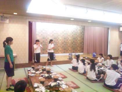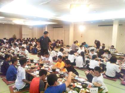 夕食です。食堂への入室前、夕食中、ごちそうさまの様子です。疲れもあるはずですが、しっかりと食べました。この後は、昨日と同じく、部ごとに就寝までの時間を過ごします。