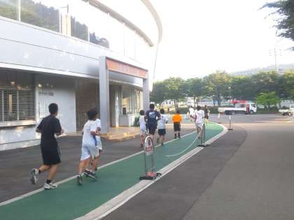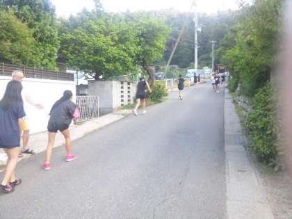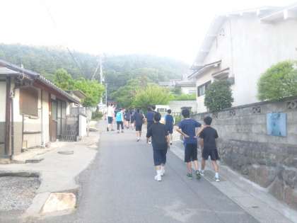 部活動合宿3日目が始まりました。今日も朝から青空に恵まれました。起床後、部ごとに、近隣の市営球場や神社の参道で体を動かします。