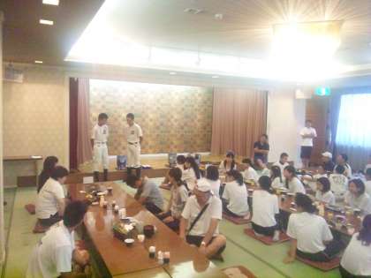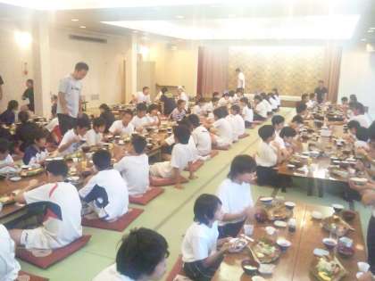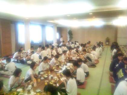 食事の様子です。しっかり食べて練習にのぞみます。片付けも手際よく、協力して、スムーズに行います。