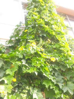 毎日暑い日が続きます。緑のカーテンの様子です。「へちま」の実が大きく育ちました。黄色い花も満開です。
