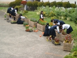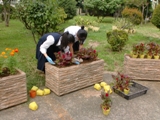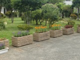 中庭のプランターにマーガレットやケイトウなどを植栽しました。