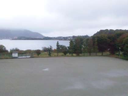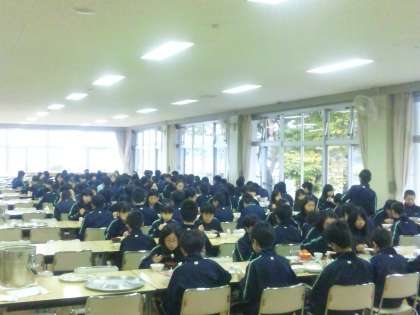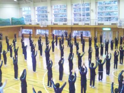 移動教室第二日目、朝の天気は小雨です。体育館での朝礼、朝食の様子です。天気予報では、一日雨模様のため、本日はクラスごとに、富士山レーダ−ドーム、鳴沢氷穴、山梨県環境科学研究所の見学をします。