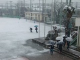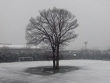 雪が降る中の登校風景と校庭の様子です。