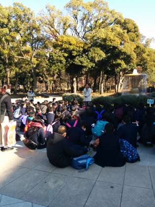 横浜公園で帰りの注意を聞いています。最後まで班でまとまって行動しましょう。