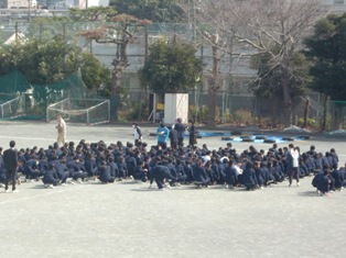 本日の訓練は、事前の連絡をしない状況で、強い地震が起きた場合を想定した内容でした。地震発生時にいち早く身の安全を確保するための「シェイクアウト訓練」を兼ねて行い、「安全行動の1(ドロップ:姿勢を低く)−2(カバー:体・頭を守って)−3(ホールド・オン:揺れが収まるまでじっとして)」を確認しました。生徒たちは、放送の指示をよく聞き、これまでに身に付けた避難に関する行動様式をしっかり理解しながら訓練に臨みました。