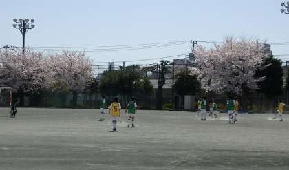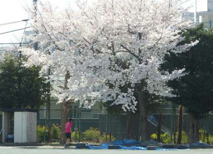 校庭の桜が満開です。桜の下で、サッカー部と陸上部が活動していました。