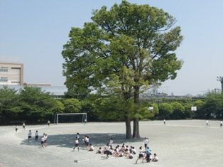 けやきの新緑が青空に映える風景の中での授業でした。