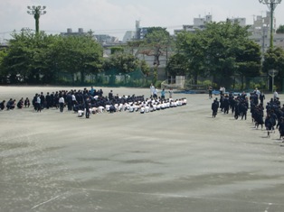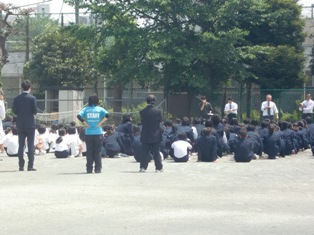 全校生徒が校庭に避難し、集合、点呼までの内容を確認しました。
