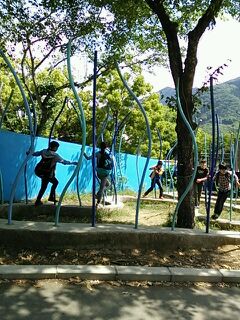 飯ごう炊さんが終わった後、先生のチェックを受けてから、ピカソのタマゴでレクリェーションを楽しんでいます。