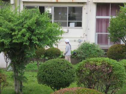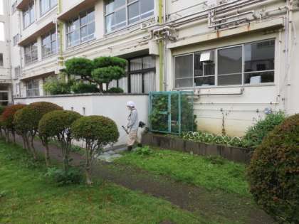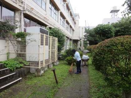 生徒が下校した後、生徒の活動に影響がでない定期考査の午後に、学校主事さんが中庭の草刈りをしてくれています。