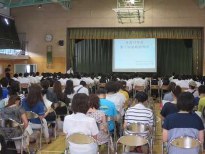 6月25日(木)に本校体育館で第1回進路説明会が行われました。3年生の生徒と約120名の保護者の方が、出席しました。