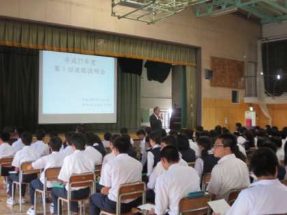 進路に関しての基本的なことについて、進路指導主任から話があり、参加者は、真剣に聞いていました。進路決定については、生徒、保護者、学校との緊密な連絡が大切です。