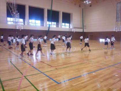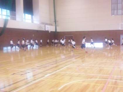 バスケットボール部の練習風景です。高い天井、広いコ−トの体育館で練習が進みます。