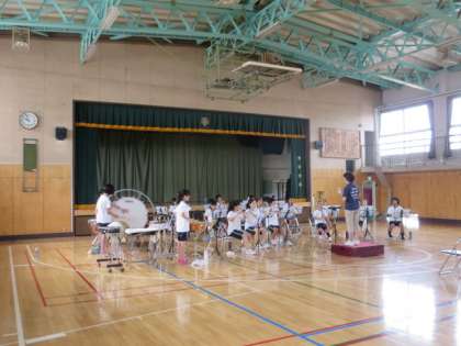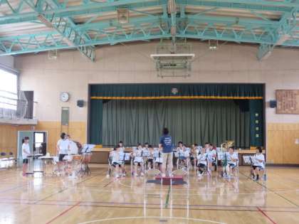 吹奏楽部が体育館で練習を行っています。8月5日(水)に行われる第55回東京都中学校吹奏楽コンクールに向けて、猛特訓を行っています。午後も音楽室で練習します。