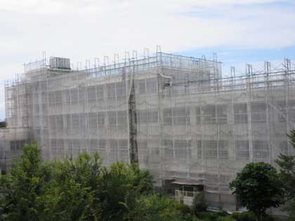 北校舎の外部改修工事が着々と進んでいます。しっかりとした足場を組んで、安全に工事を進めています。天候などの影響で大きな遅れが出なければ、9月の中旬には、工事が終わる予定です。それまでは、来校される方々には、いろいろと御不便をおかけいたしますが、御理解ください。