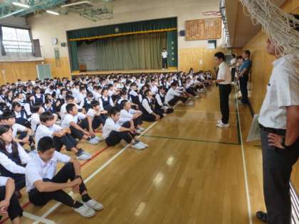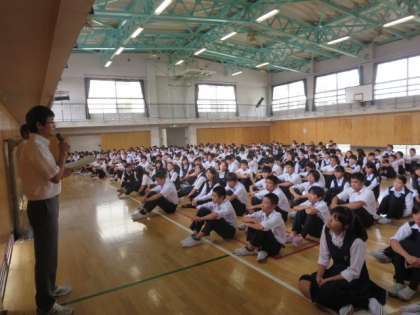 雨が降っていたため、体育館に集合する形での避難訓練となりました。