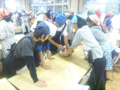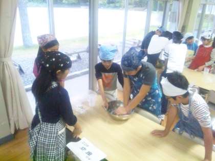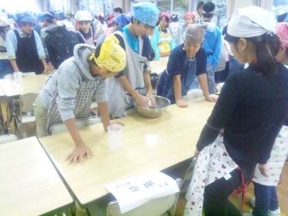 小麦粉がまとまり、かたちになってきました。どの班も美味しいうどんにするために一生懸命です。