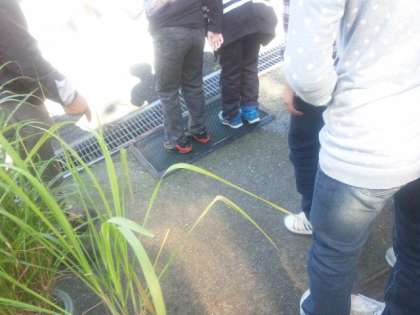 体験の前に靴の裏を消毒しました。説明をうかがいながら、体験が始まります。