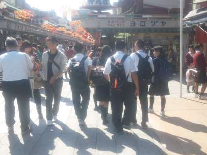 浅草を行動中のグループの様子です。参道の様子を見ながら、次の見学場所に移動します。